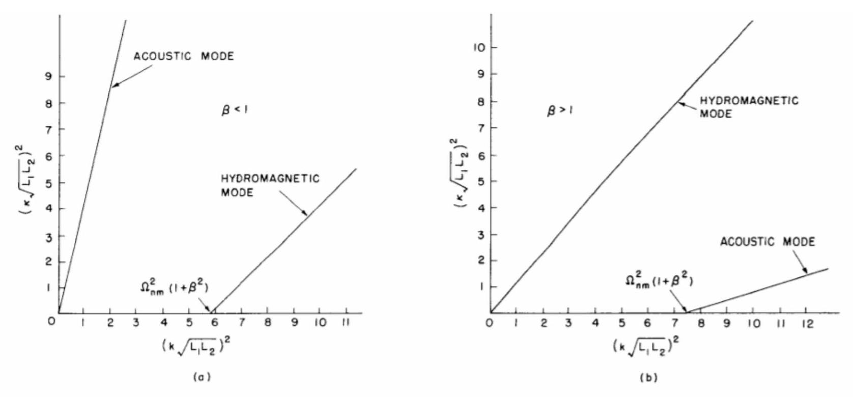 The other mode is of transverse character and represents the hydromagnetic mode. Several interesting alternatives may occur that depend upon whether p is less than or greater than unity. When P is less than unity, the acoustic mode has no cutoff for all orders of the wave eigen numbers. This is quite different from the conventional acoustic wave propagation that takes place in a pipe. The hydromagnetic mode does, however, have a cutoff that depends upon the order of the eigen number. It can be checked that whenever p < 1, the pressure from collisions, p, is considerably lower than the hydromagnetic pressure Bo/2L. This means, of course, that the collective behavior of the electrons is controlled, in large part, by the electromagnetic forces. When P > 1, we find that the hydromagnetic mode is then the mode that suffers no cutoff for all orders of the wave eigen number. The acoustic mode, on the other hand, has a cutoff frequency that depends on the order of the wave eigen number. The case of p > 1 indicates that the density of the plasma is high, and is probably more representative of the density of a liquid metal than of the density of a plasma.